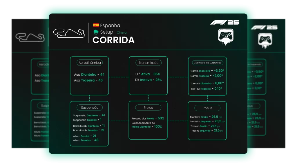 Setups prontos para todas as pistas, focados em desempenho, controle de pneus e consistência do início ao fim da corrida.